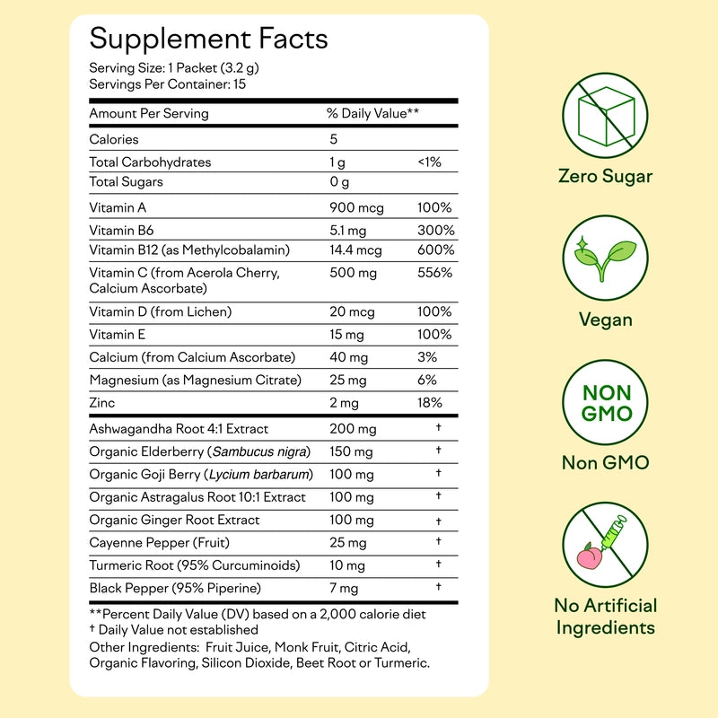 No more choking down pills or bland powders. Our delicious wild berry flavor makes boosting your immunity a treat, not a chore. Just grab a packet, mix, and go – wellness has never been this simple or tasty. Stay healthy, effortlessly.
