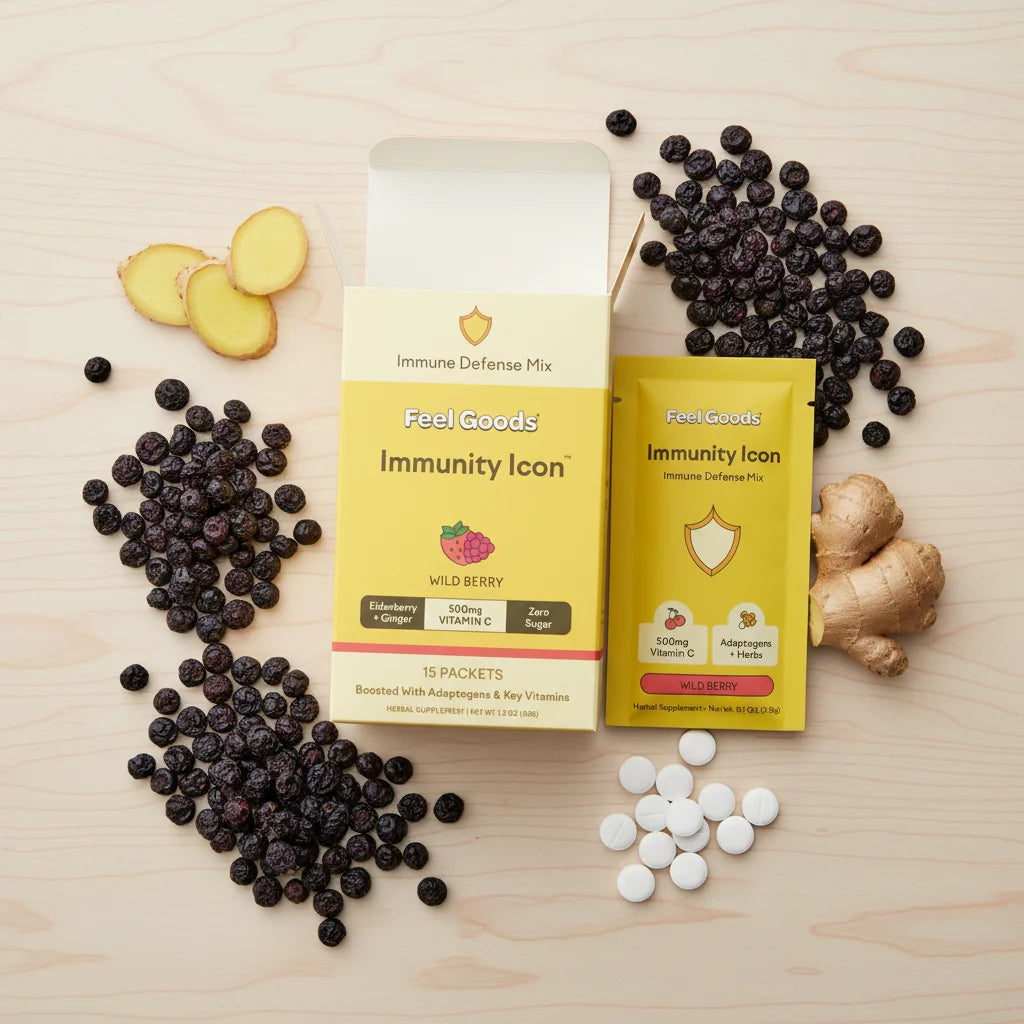 Imagine feeling strong, resilient, and ready for anything. Our wild berry Immunity Icon™ packets deliver 500mg Vitamin C, elderberry, ginger & adaptogens. Your daily shield, zero added sugar. Embrace unstoppable wellness.